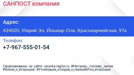 САНПОСТ, компания по адресу 424020, Марий Эл, Йошкар-Ола, Красноармейская, 97а в дальнейшем Организация, размещена в следующих категориях: