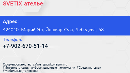SVETIX, ателье по адресу 424040, Марий Эл, Йошкар-Ола, Лебедева, 53 в дальнейшем Организация, размещена в следующих категориях: