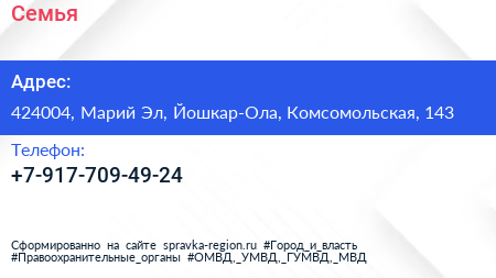 Семья по адресу 424004, Марий Эл, Йошкар-Ола, Комсомольская, 143 в дальнейшем Организация, размещена в следующих категориях: