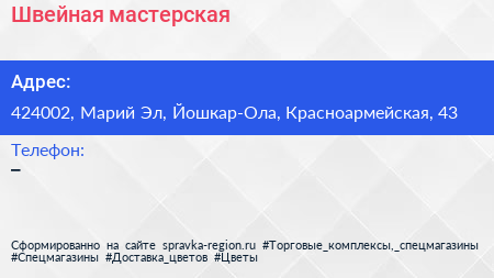 Швейная мастерская по адресу 424002, Марий Эл, Йошкар-Ола, Красноармейская, 43 в дальнейшем Организация, размещена в следующих категориях: