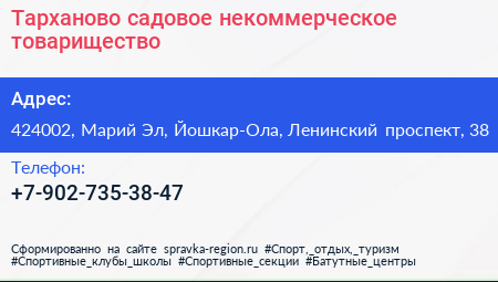 Тарханово, садовое некоммерческое товарищество по адресу 424002, Марий Эл, Йошкар-Ола, Ленинский проспект, 38 в дальнейшем Организация, размещена в следующих категориях: