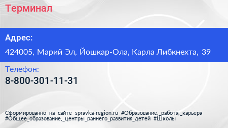 Терминал по адресу 424005, Марий Эл, Йошкар-Ола, Карла Либкнехта, 39 в дальнейшем Организация, размещена в следующих категориях: