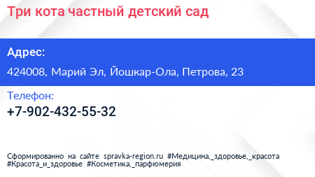 Три кота, частный детский сад по адресу 424008, Марий Эл, Йошкар-Ола, Петрова, 23 в дальнейшем Организация, размещена в следующих категориях: