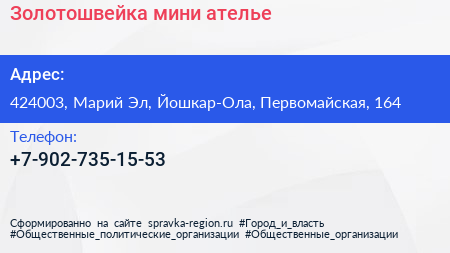 Золотошвейка, мини-ателье по адресу 424003, Марий Эл, Йошкар-Ола, Первомайская, 164 в дальнейшем Организация, размещена в следующих категориях: