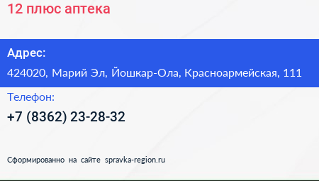 12 плюс, аптека по адресу 424020, Марий Эл, Йошкар-Ола, Красноармейская, 111 в дальнейшем Организация, размещена в следующих категориях: