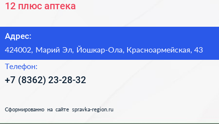 12 плюс, аптека по адресу 424002, Марий Эл, Йошкар-Ола, Красноармейская, 43 в дальнейшем Организация, размещена в следующих категориях: