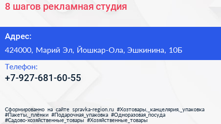 8 шагов, рекламная студия по адресу 424000, Марий Эл, Йошкар-Ола, Эшкинина, 10Б в дальнейшем Организация, размещена в следующих категориях: