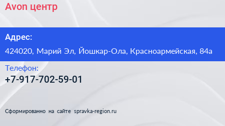 Avon, центр по адресу 424020, Марий Эл, Йошкар-Ола, Красноармейская, 84а в дальнейшем Организация, размещена в следующих категориях: