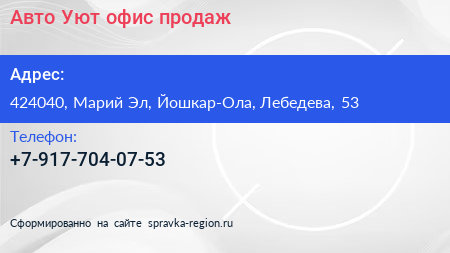 Авто Уют, офис продаж по адресу 424040, Марий Эл, Йошкар-Ола, Лебедева, 53 в дальнейшем Организация, размещена в следующих категориях: