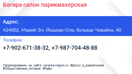 Багира, салон-парикмахерская по адресу 424002, Марий Эл, Йошкар-Ола, бульвар Чавайна, 40 в дальнейшем Организация, размещена в следующих категориях: