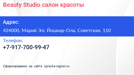 Beauty Studio, салон красоты по адресу 424000, Марий Эл, Йошкар-Ола, Советская, 110 в дальнейшем Организация, размещена в следующих категориях: