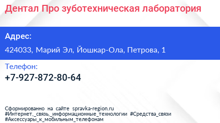 Дентал Про, зуботехническая лаборатория по адресу 424033, Марий Эл, Йошкар-Ола, Петрова, 1 в дальнейшем Организация, размещена в следующих категориях: