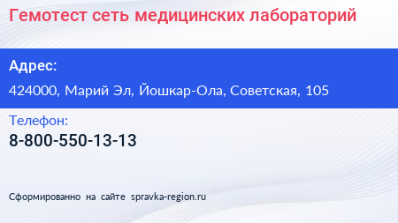 Гемотест, сеть медицинских лабораторий по адресу 424000, Марий Эл, Йошкар-Ола, Советская, 105 в дальнейшем Организация, размещена в следующих категориях: