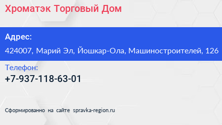 Хроматэк Торговый Дом по адресу 424007, Марий Эл, Йошкар-Ола, Машиностроителей, 126 в дальнейшем Организация, размещена в следующих категориях: