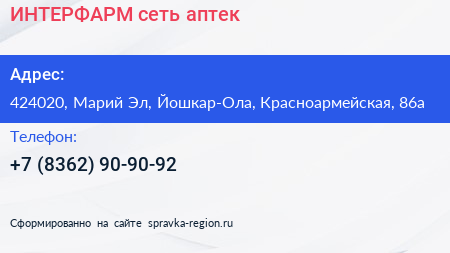 ИНТЕРФАРМ, сеть аптек по адресу 424020, Марий Эл, Йошкар-Ола, Красноармейская, 86а в дальнейшем Организация, размещена в следующих категориях: