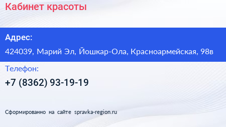 Кабинет красоты по адресу 424039, Марий Эл, Йошкар-Ола, Красноармейская, 98в в дальнейшем Организация, размещена в следующих категориях: