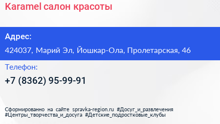 Karamel, салон красоты по адресу 424037, Марий Эл, Йошкар-Ола, Пролетарская, 46 в дальнейшем Организация, размещена в следующих категориях: