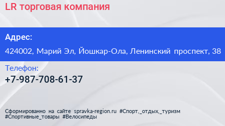 LR, торговая компания по адресу 424002, Марий Эл, Йошкар-Ола, Ленинский проспект, 38 в дальнейшем Организация, размещена в следующих категориях: