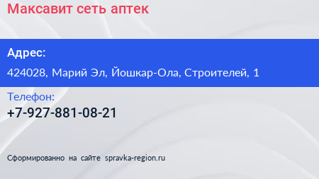 Максавит, сеть аптек по адресу 424028, Марий Эл, Йошкар-Ола, Строителей, 1 в дальнейшем Организация, размещена в следующих категориях: