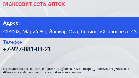 Максавит, сеть аптек по адресу 424003, Марий Эл, Йошкар-Ола, Ленинский проспект, 43 в дальнейшем Организация, размещена в следующих категориях: