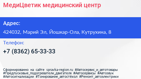 МедиЦветик, медицинский центр по адресу 424032, Марий Эл, Йошкар-Ола, Кутрухина, 8 в дальнейшем Организация, размещена в следующих категориях: