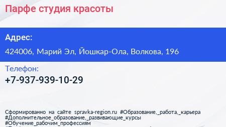 Парфе, студия красоты по адресу 424006, Марий Эл, Йошкар-Ола, Волкова, 196 в дальнейшем Организация, размещена в следующих категориях: