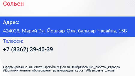 Сольен по адресу 424038, Марий Эл, Йошкар-Ола, бульвар Чавайна, 15Б в дальнейшем Организация, размещена в следующих категориях:
