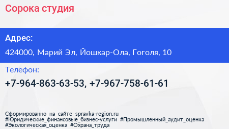 Сорока, студия по адресу 424000, Марий Эл, Йошкар-Ола, Гоголя, 10 в дальнейшем Организация, размещена в следующих категориях: