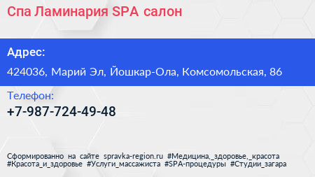 Спа-Ламинария, SPA-салон по адресу 424036, Марий Эл, Йошкар-Ола, Комсомольская, 86 в дальнейшем Организация, размещена в следующих категориях: