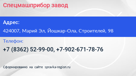 Спецмашприбор, завод по адресу 424007, Марий Эл, Йошкар-Ола, Строителей, 98 в дальнейшем Организация, размещена в следующих категориях: