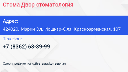 Стома-Двор, стоматология по адресу 424020, Марий Эл, Йошкар-Ола, Красноармейская, 107 в дальнейшем Организация, размещена в следующих категориях:
