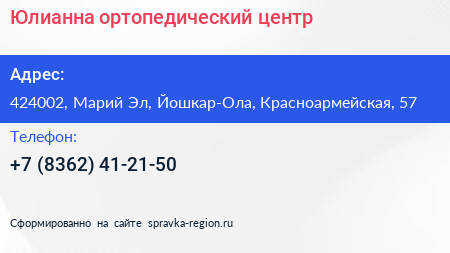 Юлианна, ортопедический центр по адресу 424002, Марий Эл, Йошкар-Ола, Красноармейская, 57 в дальнейшем Организация, размещена в следующих категориях: