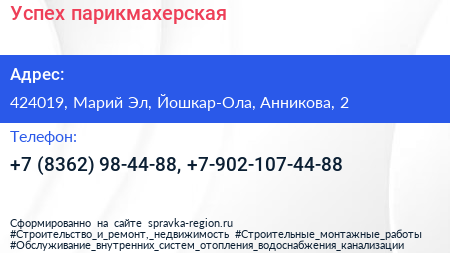 Успех, парикмахерская по адресу 424019, Марий Эл, Йошкар-Ола, Анникова, 2 в дальнейшем Организация, размещена в следующих категориях: