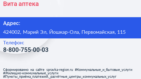 Вита, аптека по адресу 424002, Марий Эл, Йошкар-Ола, Первомайская, 115 в дальнейшем Организация, размещена в следующих категориях: