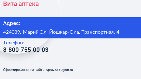 Вита, аптека по адресу 424039, Марий Эл, Йошкар-Ола, Транспортная, 4 в дальнейшем Организация, размещена в следующих категориях: