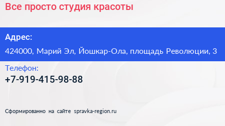 Все просто, студия красоты по адресу 424000, Марий Эл, Йошкар-Ола, площадь Революции, 3 в дальнейшем Организация, размещена в следующих категориях: