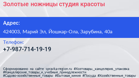 Золотые ножницы, студия красоты по адресу 424003, Марий Эл, Йошкар-Ола, Зарубина, 40а в дальнейшем Организация, размещена в следующих категориях: