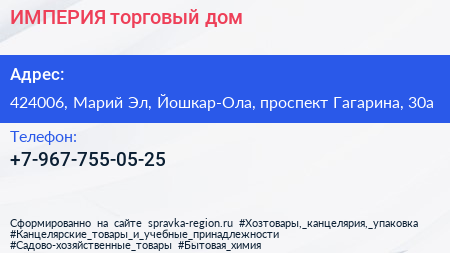 ИМПЕРИЯ, торговый дом по адресу 424006, Марий Эл, Йошкар-Ола, проспект Гагарина, 30а в дальнейшем Организация, размещена в следующих категориях: