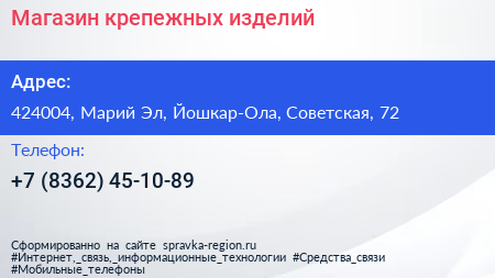 Магазин крепежных изделий по адресу 424004, Марий Эл, Йошкар-Ола, Советская, 72 в дальнейшем Организация, размещена в следующих категориях: