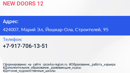 NEW DOORS 12 по адресу 424007, Марий Эл, Йошкар-Ола, Строителей, 95 в дальнейшем Организация, размещена в следующих категориях:
