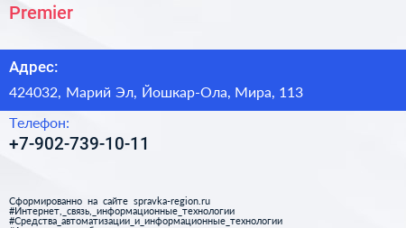Premier по адресу 424032, Марий Эл, Йошкар-Ола, Мира, 113 в дальнейшем Организация, размещена в следующих категориях: