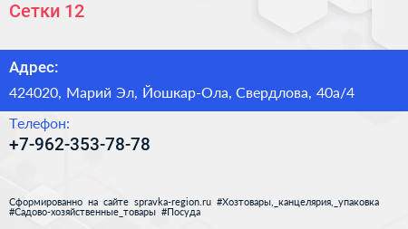 Сетки 12 по адресу 424020, Марий Эл, Йошкар-Ола, Свердлова, 40а/4 в дальнейшем Организация, размещена в следующих категориях: