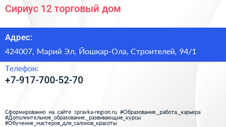Сириус 12, торговый дом по адресу 424007, Марий Эл, Йошкар-Ола, Строителей, 94/1 в дальнейшем Организация, размещена в следующих категориях: