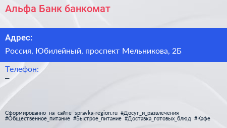 Альфа-Банк, банкомат по адресу Альфа-Банк, 2Б, проспект Мельникова, Родионово, Новокуркино, Новые Химки, Химки, городской округ Химки, Московская область, Центральный федеральный округ, 141501, Россия в дальнейшем Организация, размещена в следующих категориях: