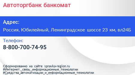 Автоторгбанк, банкомат по адресу Тойота Центр Шереметьево, 23, Ленинградское шоссе, Родионово, микрорайон ИКЕА, Химки, городской округ Химки, Московская область, Центральный федеральный округ, 141410, Россия в дальнейшем Организация, размещена в следующих категориях: