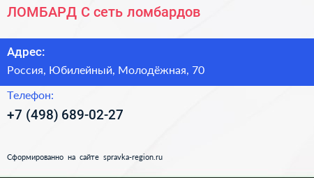 ЛОМБАРД-С, сеть ломбардов по адресу Ломбард-С, 70, Молодёжная улица, Новокуркино, район Куркино, Химки, городской округ Химки, Московская область, Центральный федеральный округ, 141501, Россия в дальнейшем Организация, размещена в следующих категориях: