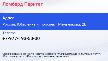 Ломбард Паритет по адресу Пятёрочка, 2Б, проспект Мельникова, Родионово, Новокуркино, Новые Химки, Химки, городской округ Химки, Московская область, Центральный федеральный округ, 141410, Россия в дальнейшем Организация, размещена в следующих категориях: