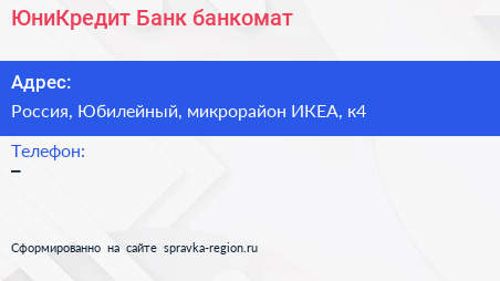 ЮниКредит Банк, банкомат по адресу МЕГА Химки, 1, Ленинградское шоссе, Родионово, микрорайон ИКЕА, Химки, городской округ Химки, Московская область, Центральный федеральный округ, 141410, Россия в дальнейшем Организация, размещена в следующих категориях:
