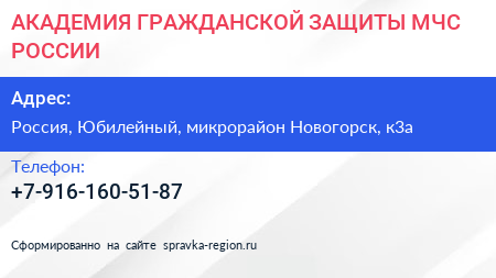 АКАДЕМИЯ ГРАЖДАНСКОЙ ЗАЩИТЫ МЧС РОССИИ по адресу Академия гражданской защиты МЧС России, Соколовская улица, Новогорск, Химки, городской округ Химки, Московская область, Центральный федеральный округ, 141435, Россия в дальнейшем Организация, размещена в следующих категориях: