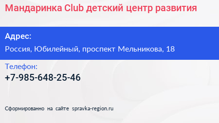 Мандаринка Club, детский центр развития по адресу 18, проспект Мельникова, Родионово, Новокуркино, Новые Химки, Химки, городской округ Химки, Московская область, Центральный федеральный округ, 141410, Россия в дальнейшем Организация, размещена в следующих категориях: